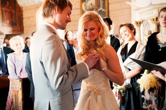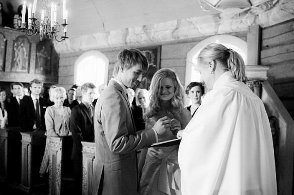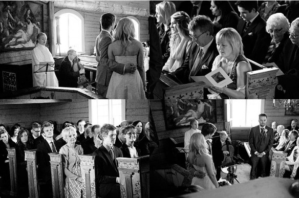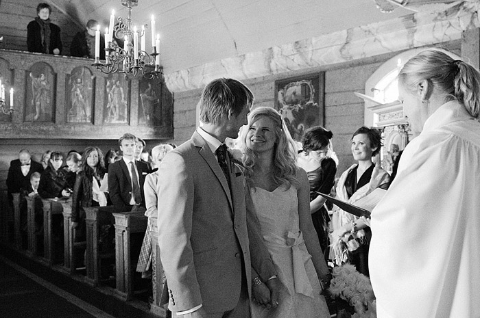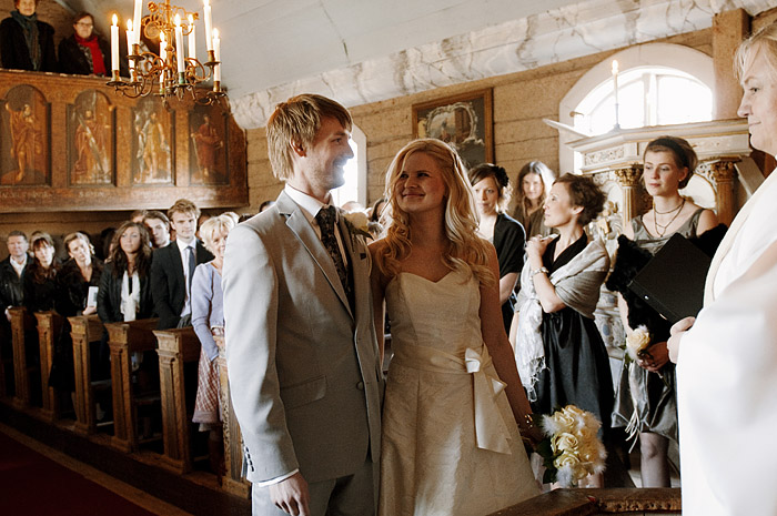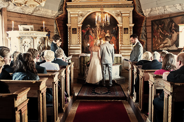 Den ursöta gamla kyrkan Öijareds kapell med anor från 1600 – talet var fylld till sista plats med vänner och släktingar. Prästen berättade att alla hade fått provsitta för att testa så att man fick plats innan brudparet anlände. Vigselakten var otroligt romantisk och vacker, jag räknar den som min favorit av alla vigslar som jag fotograferat. Den kvinnliga vigselförättaren stod även för vacker solosång tillsammans med en jätteduktig cellist som ackompanjatör vilket förhöjde stämningen i mitt tycke.