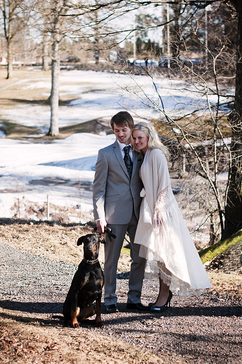 När jag träffade Johanna och Peter för första gången så visste jag att det skulle bli ett magiskt bröllop, och det blev det. Vad jag inte var förberedd på var att porträttfotograferingen skulle ske utomhus i starkt solsken utan en enda skugga att tillgå. Det fanns några träd i närheten men eftersom det var i mars så fanns det inte ett enda löv på dom. Att hitta det perfekta ljuset är ju som bekant alla fotografers önskan, och har man sedan ett sådant vackert par framför linsen så är ju lyckan fullständig. Det löste sig som väl var ändå tack vare min otrolig assistent L som kunde dämpa den värsta solen med en reflexskärm, men det var riktigt marig.